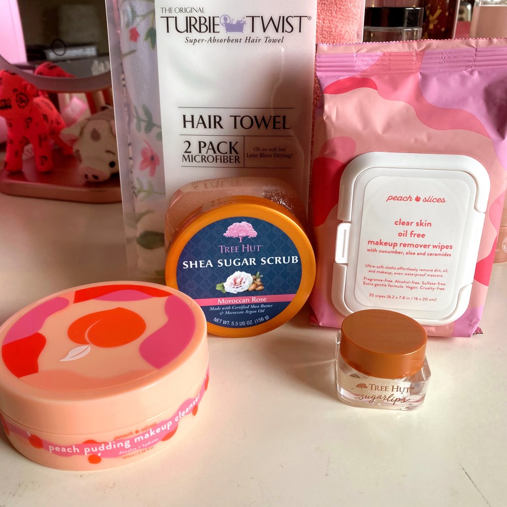 So I got some hair turbans and small sized sugar scrubs and some Korean makeup wipes and cleanser that I’m excited to try out!