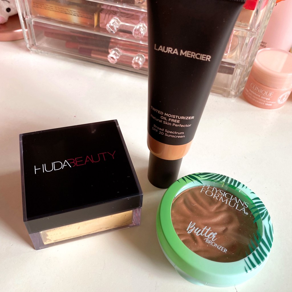 Then I got a Laura Mercier tinted moisturizer, the Huda Beauty setting powder and a physician’s formula butter bronzer
