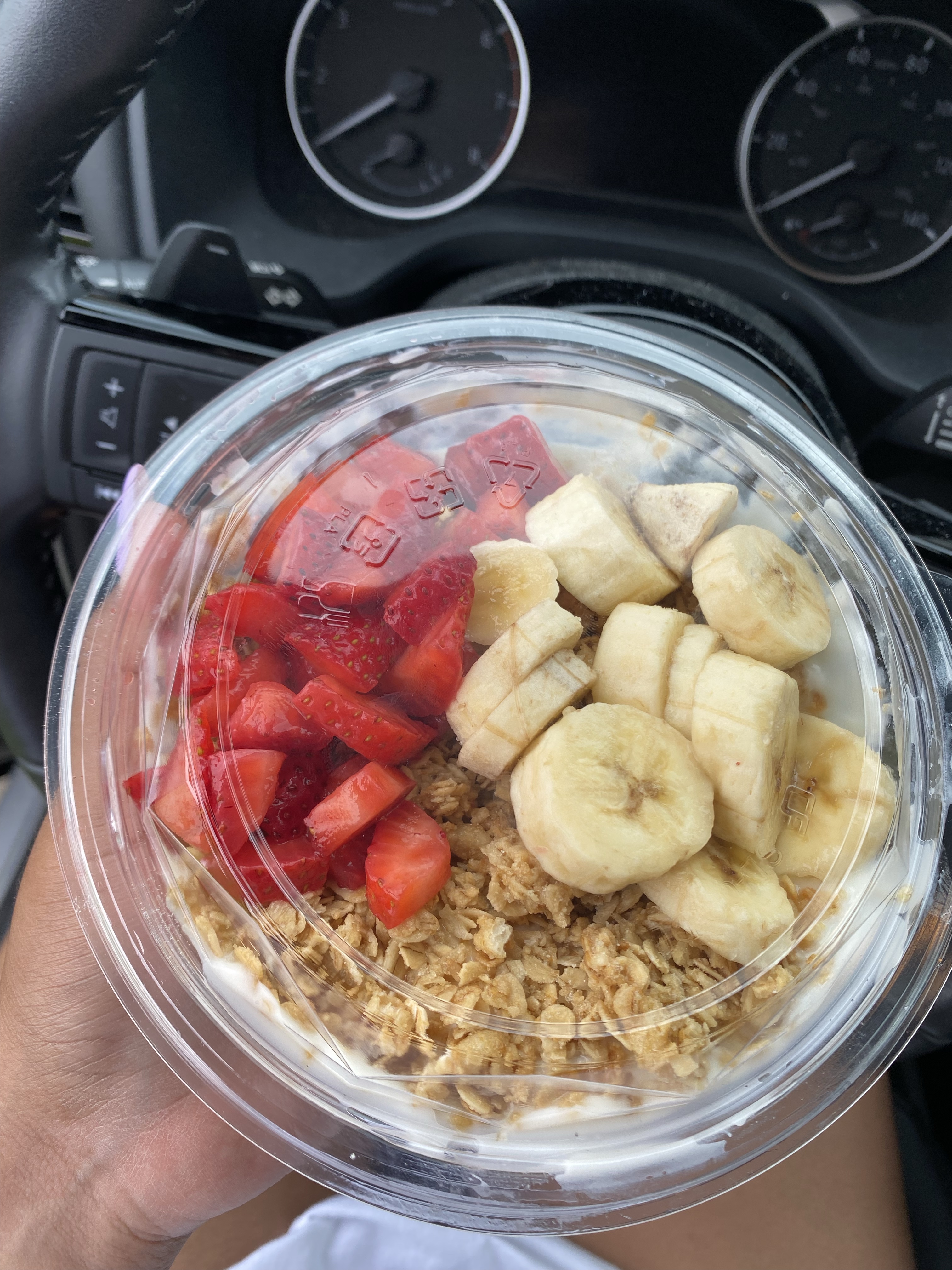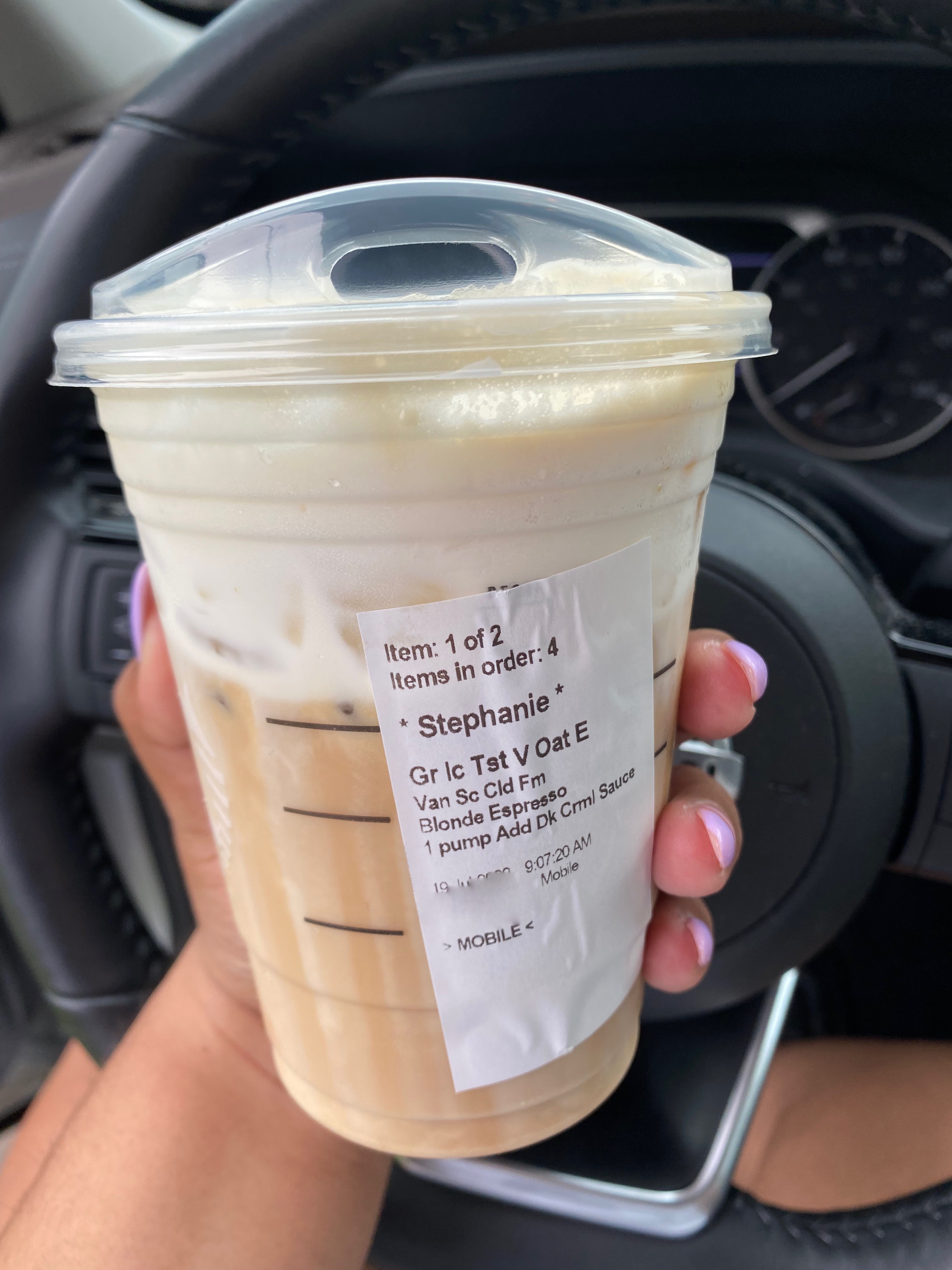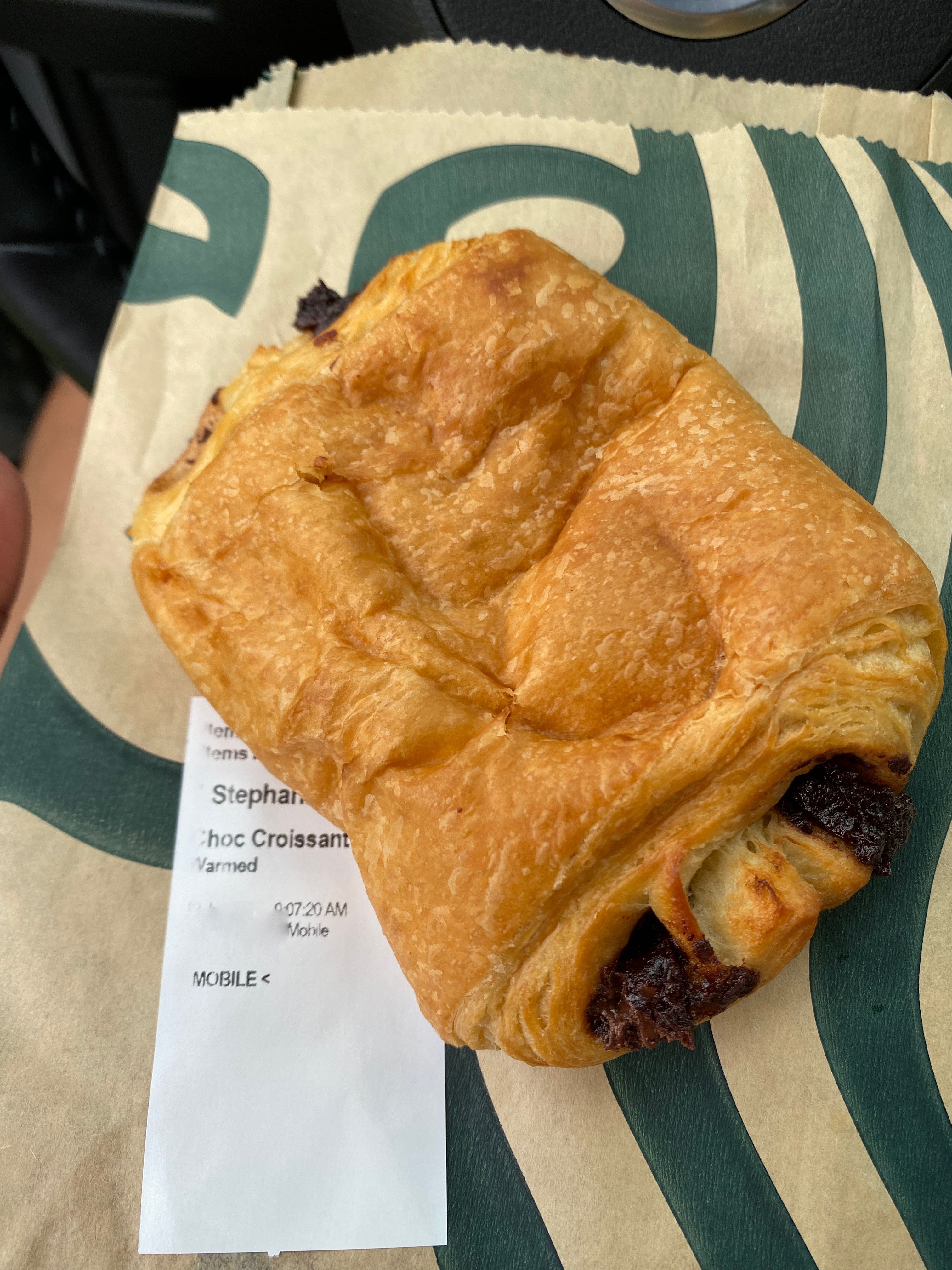 So for breakfast I got a yogurt bowl which is my favorite thing to get in the mornings and on this morning, I decided to treat myself to some Starbucks. I usually get my usual Grande iced caramel macchiato, but wanted to try something new so I got the Iced Toasted Vanilla Oatmilk Shaken Espresso with dark caramel drizzle and vanilla cold foam and it was delicious, a new favorite. The last thing I got was a chocolate croissant for a little sweat treat later in the day.