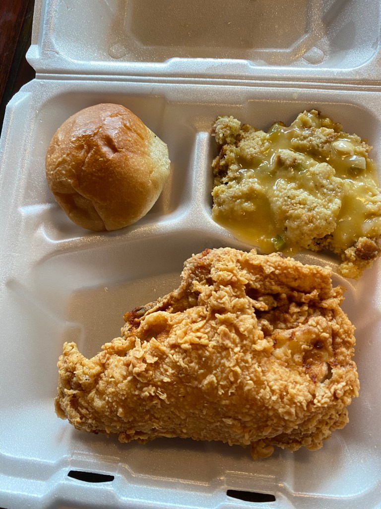 For lunch, I had fried chicken with a side of cornbread dressing and gravy with a roll. It’s not the healthiest of lunches, but I was craving some fried chicken and it did not disappoint. I am kind of upset that they didn’t include the steam cabbage I had ordered, but it was good, nonetheless.