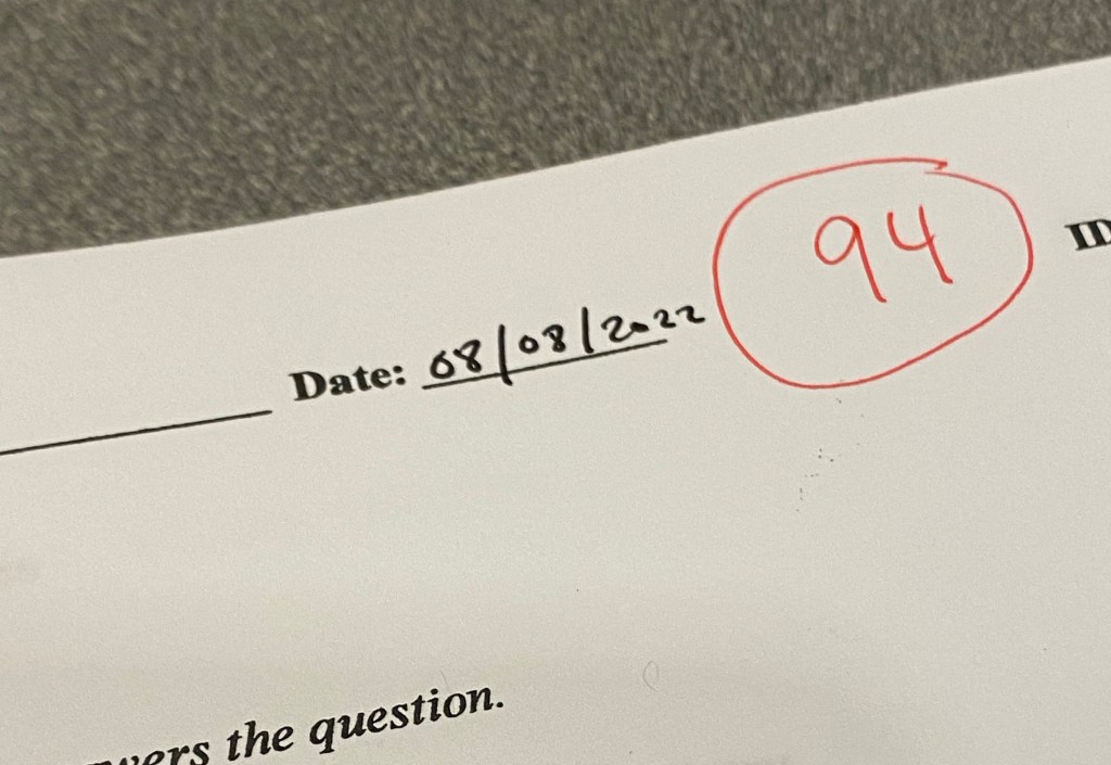 So I’m happy to say that I got a 94 on my first test and I’m proud of myself, I’ve been doing good and will continue to do so.