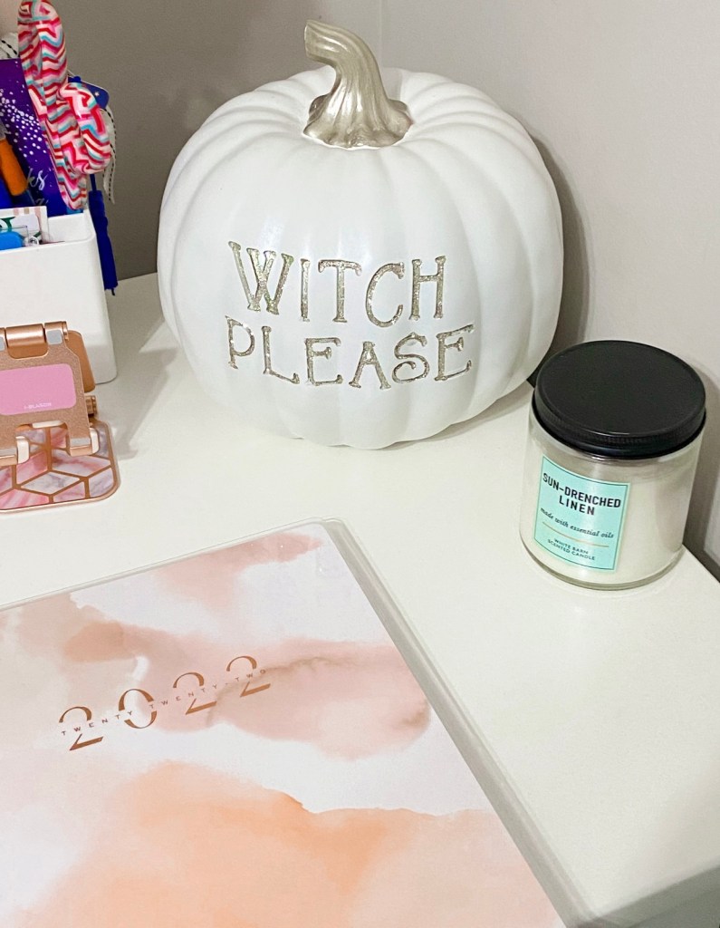 I got this cute little white pumpkin with the “Witch Please” on it and I am loving how it looks on my night stand.